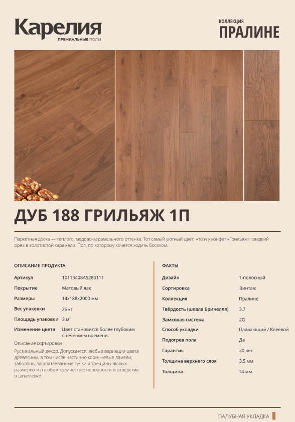 Паркетная доска Karelia Пралине 10113408A5280111 Дуб Грильяж брашированный однополосный матовый лак, 2000*188*14 мм