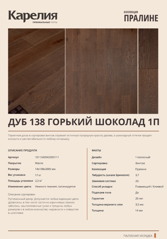 Паркетная доска Karelia Пралине 10113439A5393111 Дуб Горький Шоколад брашированный однополосный под маслом, 2000*138*14 мм