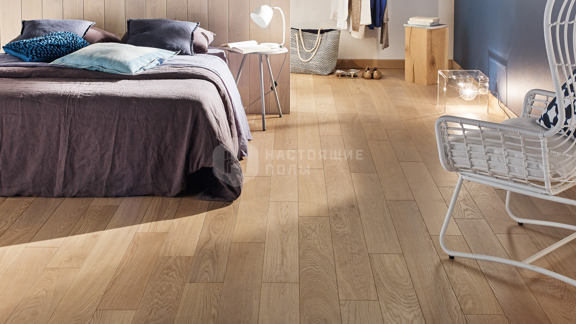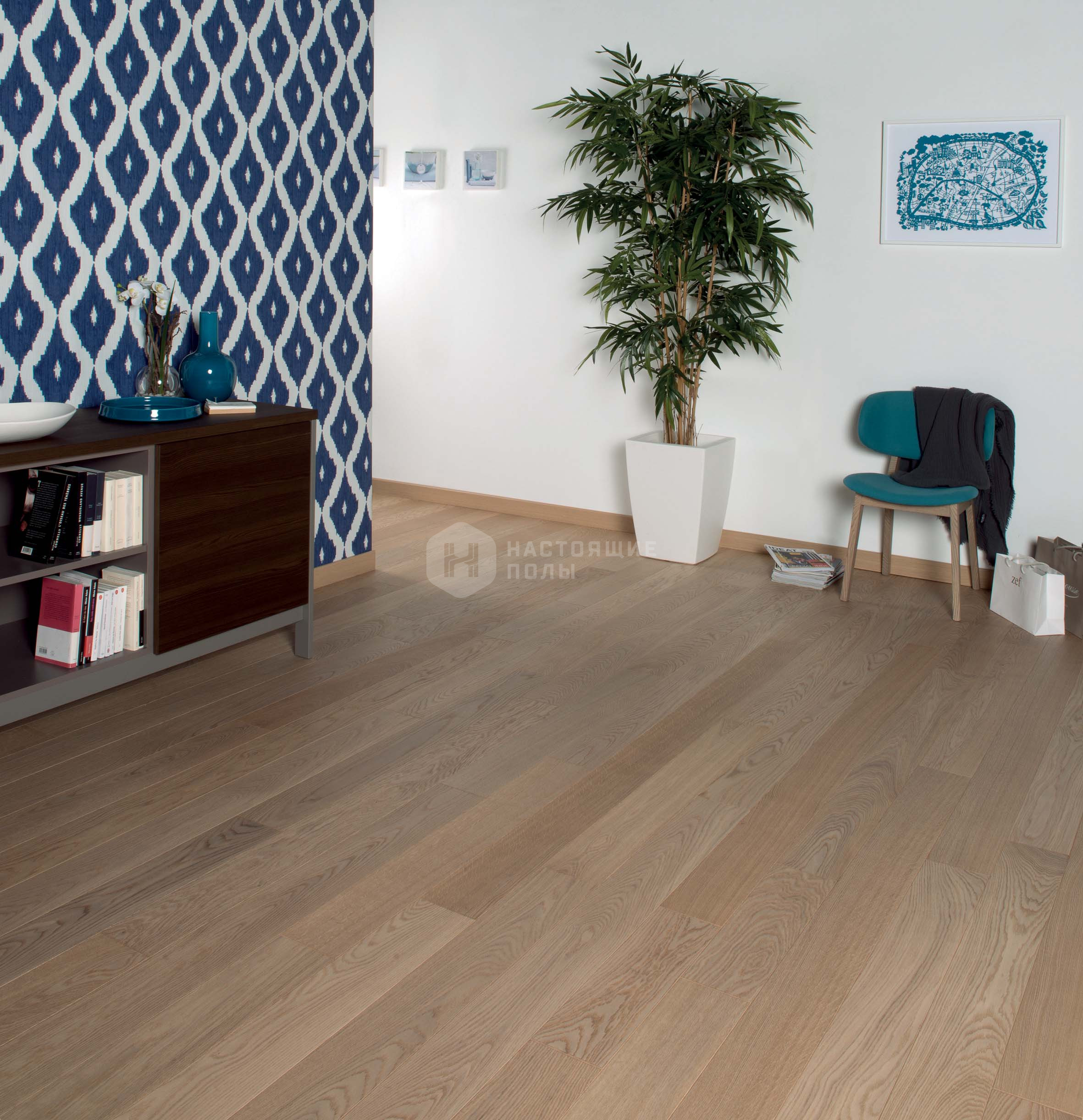 легкая вуаль белого оттенка на брашированной поверхности французского дуба под матовым лаком. Легчайший оттенок белого подчеркивает природную красоту дерева и привносит тепло и свет в интерьер.