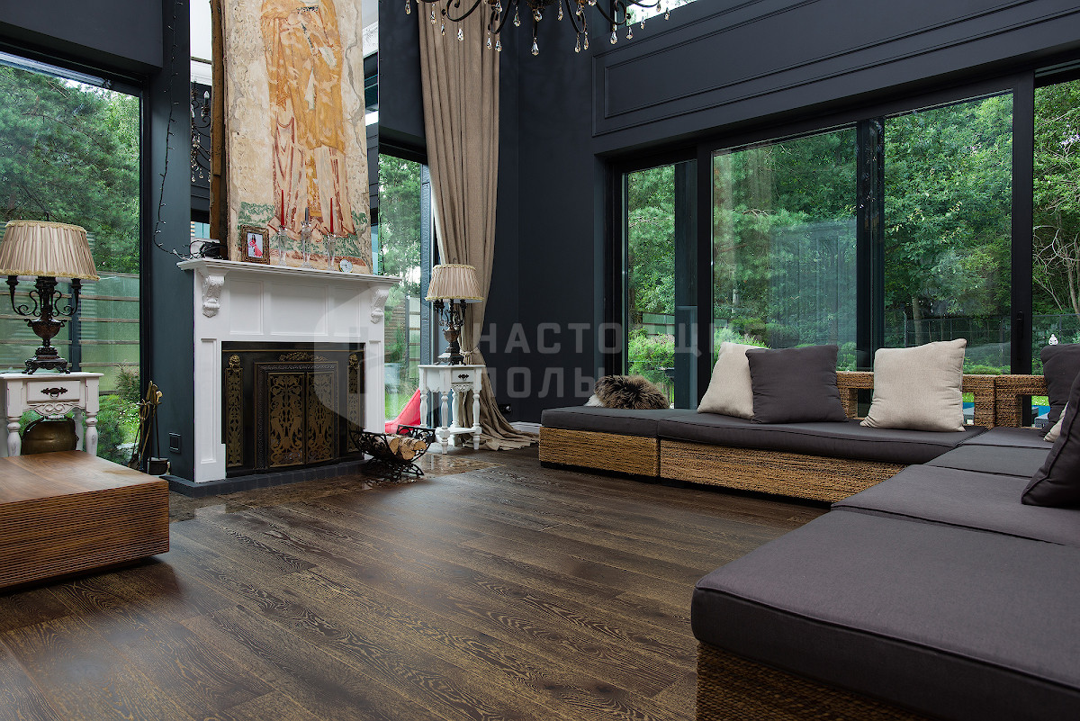 Формат паркета, когда верхний слой доски - это единый пласт благородной древесины, как здесь, например. Вне зависимости от ширины, именно такие декоры считаются самыми интересными. Здесь есть где показать всю красоту дерева, переходы цвета, селекцию, сучки и другие особенности древесины. Все новые цвета сначала выпускаются в однополосном формате, а уже потом, если дизайн пользуется популярностью, его повторяют в менее дорогих вариантах.