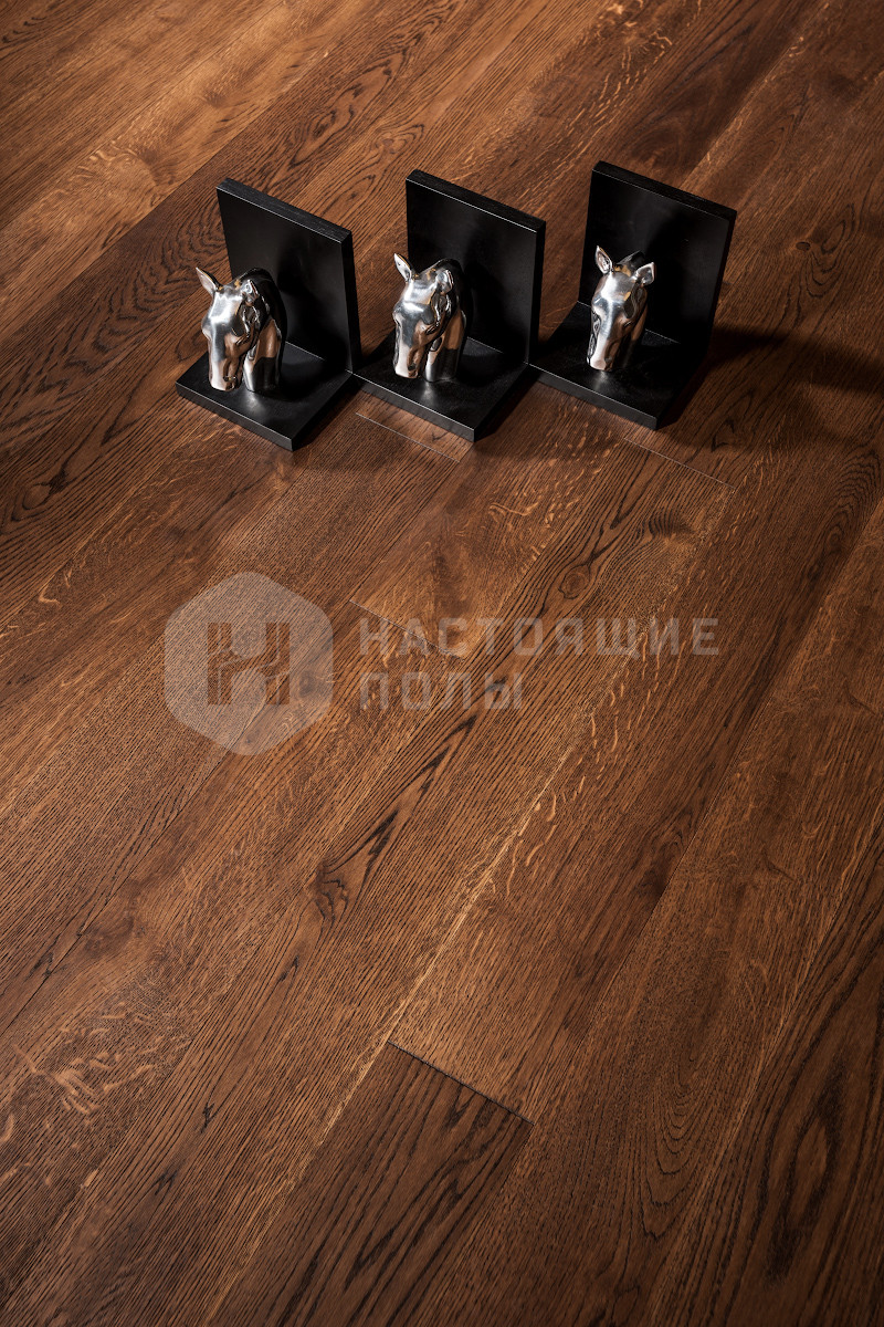 Формат паркета, когда верхний слой доски - это единый пласт благородной древесины, как здесь, например. Вне зависимости от ширины, именно такие декоры считаются самыми интересными. Здесь есть где показать всю красоту дерева, переходы цвета, селекцию, сучки и другие особенности древесины. Все новые цвета сначала выпускаются в однополосном формате, а уже потом, если дизайн пользуется популярностью, его повторяют в менее дорогих вариантах.