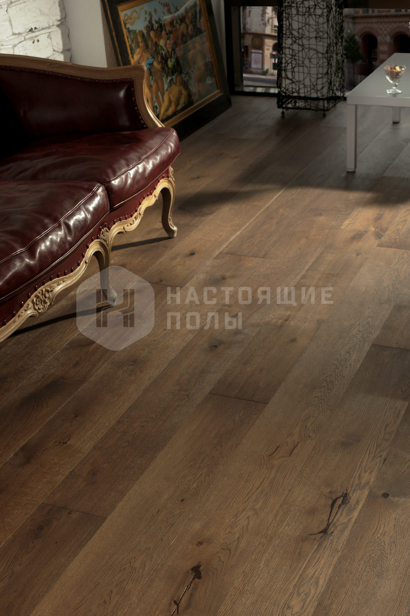 Сильные перепады по цвету, заболонь, древесные прожилки и нечеткие линии волокон дерева (свилеватость). Открытые и отреставрированные сучки всех размеров и типов. Допускается наличие червоточин. На поверхности присутствуют также трещины от усушки дерева, придающие материалу солидный эффект многолетнего покрытия.