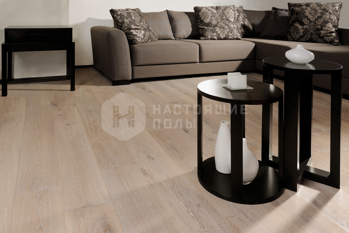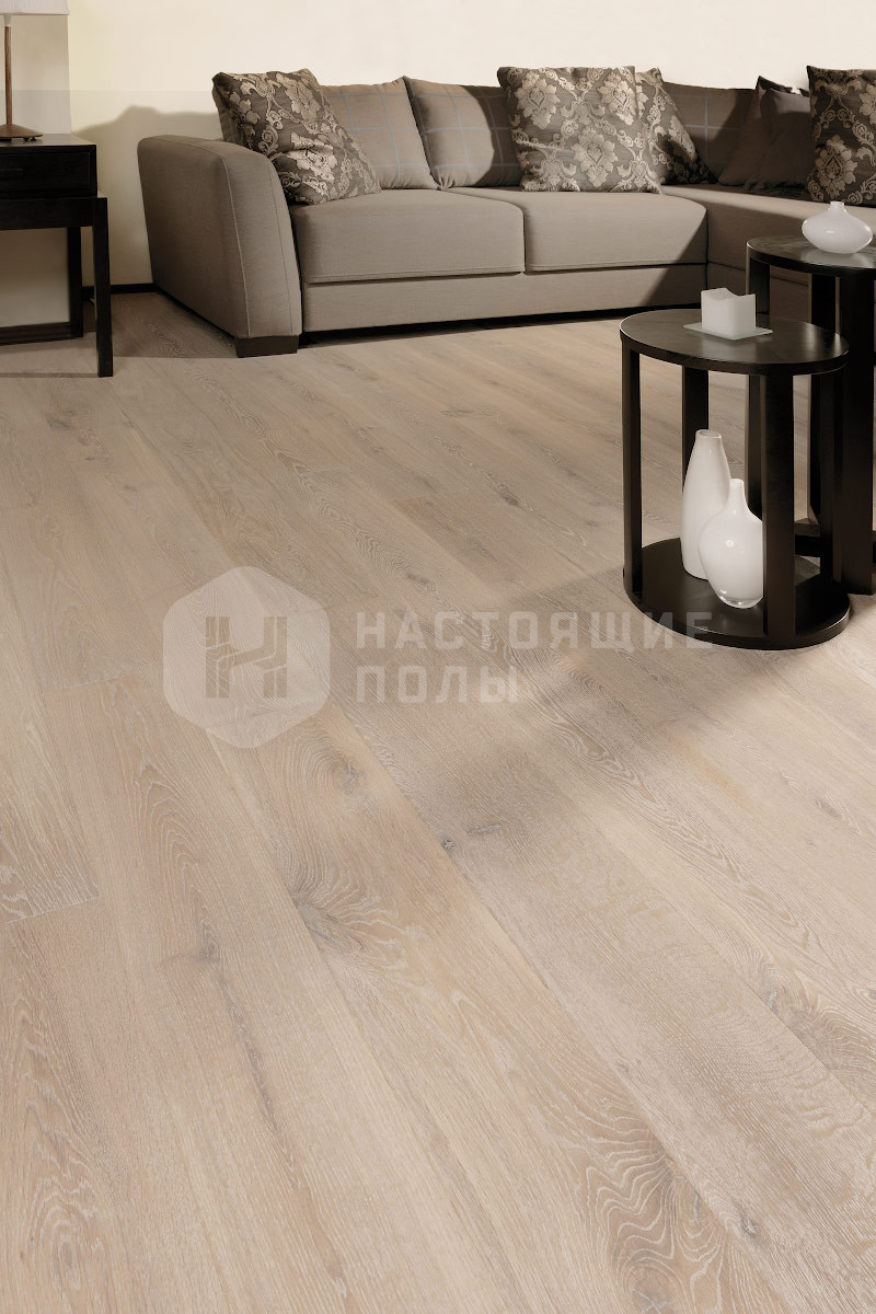 Формат паркета, когда верхний слой доски - это единый пласт благородной древесины, как здесь, например. Вне зависимости от ширины, именно такие декоры считаются самыми интересными. Здесь есть где показать всю красоту дерева, переходы цвета, селекцию, сучки и другие особенности древесины. Все новые цвета сначала выпускаются в однополосном формате, а уже потом, если дизайн пользуется популярностью, его повторяют в менее дорогих вариантах.