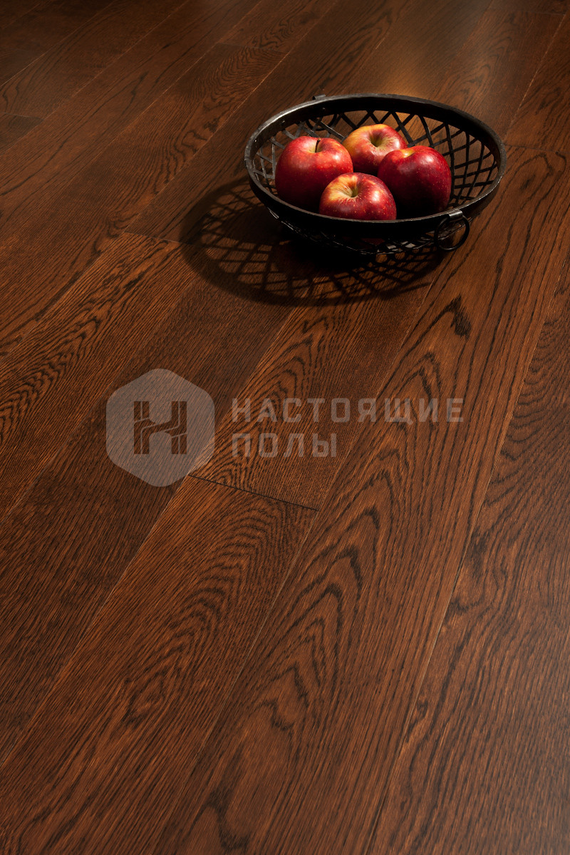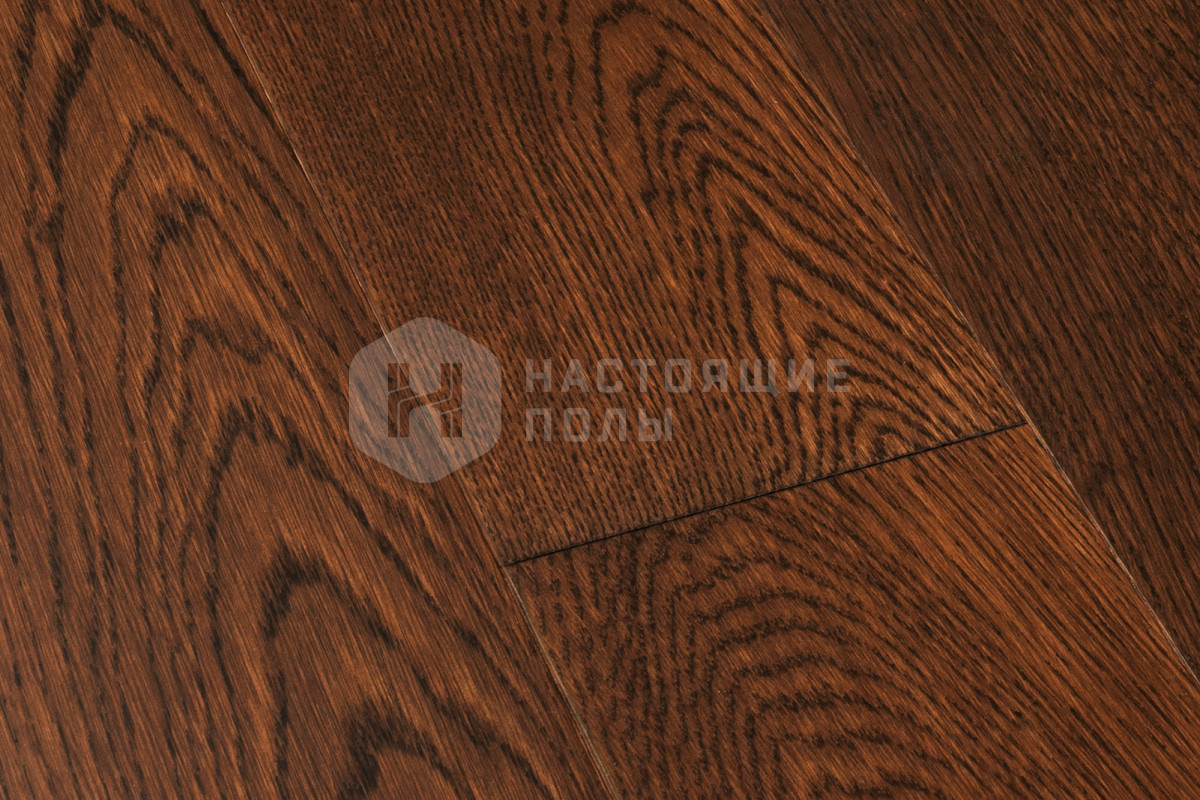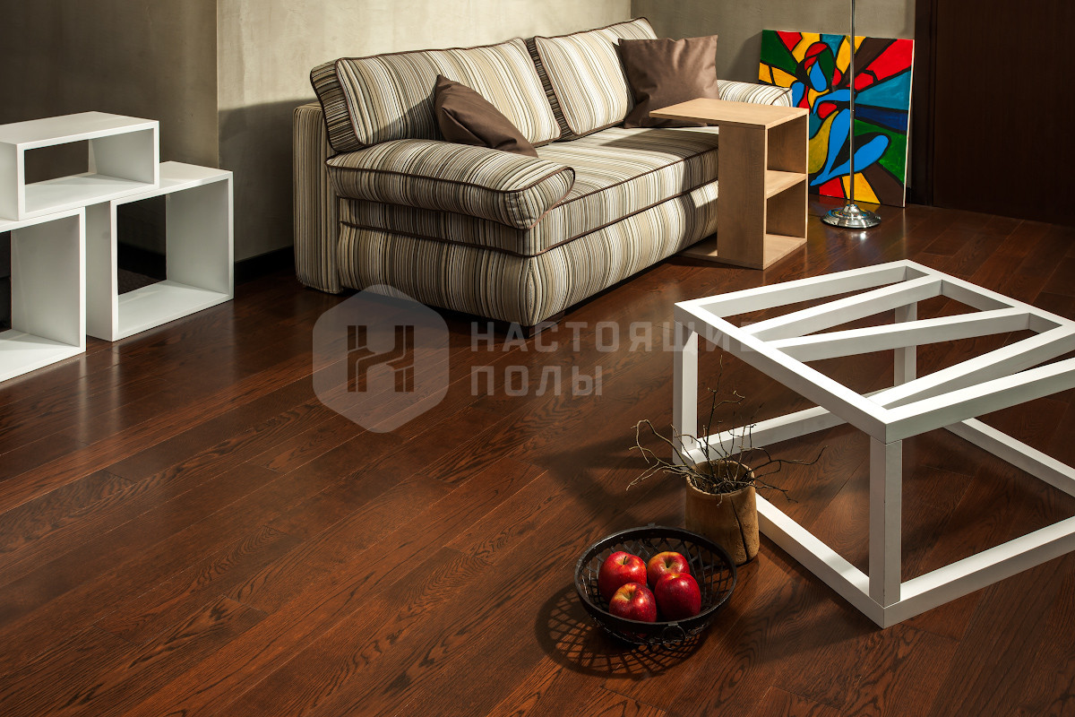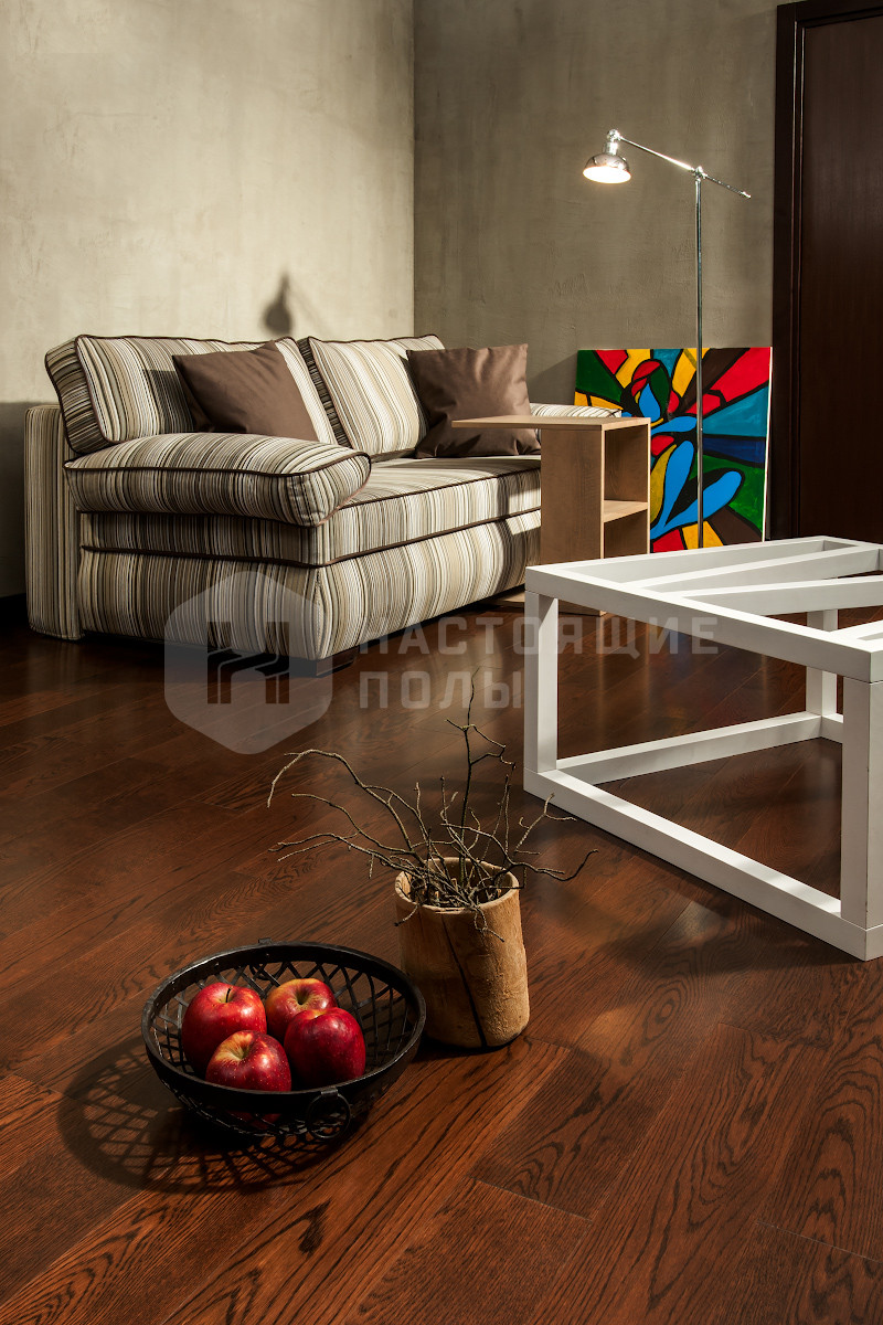 Формат паркета, когда верхний слой доски - это единый пласт благородной древесины, как здесь, например. Вне зависимости от ширины, именно такие декоры считаются самыми интересными. Здесь есть где показать всю красоту дерева, переходы цвета, селекцию, сучки и другие особенности древесины. Все новые цвета сначала выпускаются в однополосном формате, а уже потом, если дизайн пользуется популярностью, его повторяют в менее дорогих вариантах.