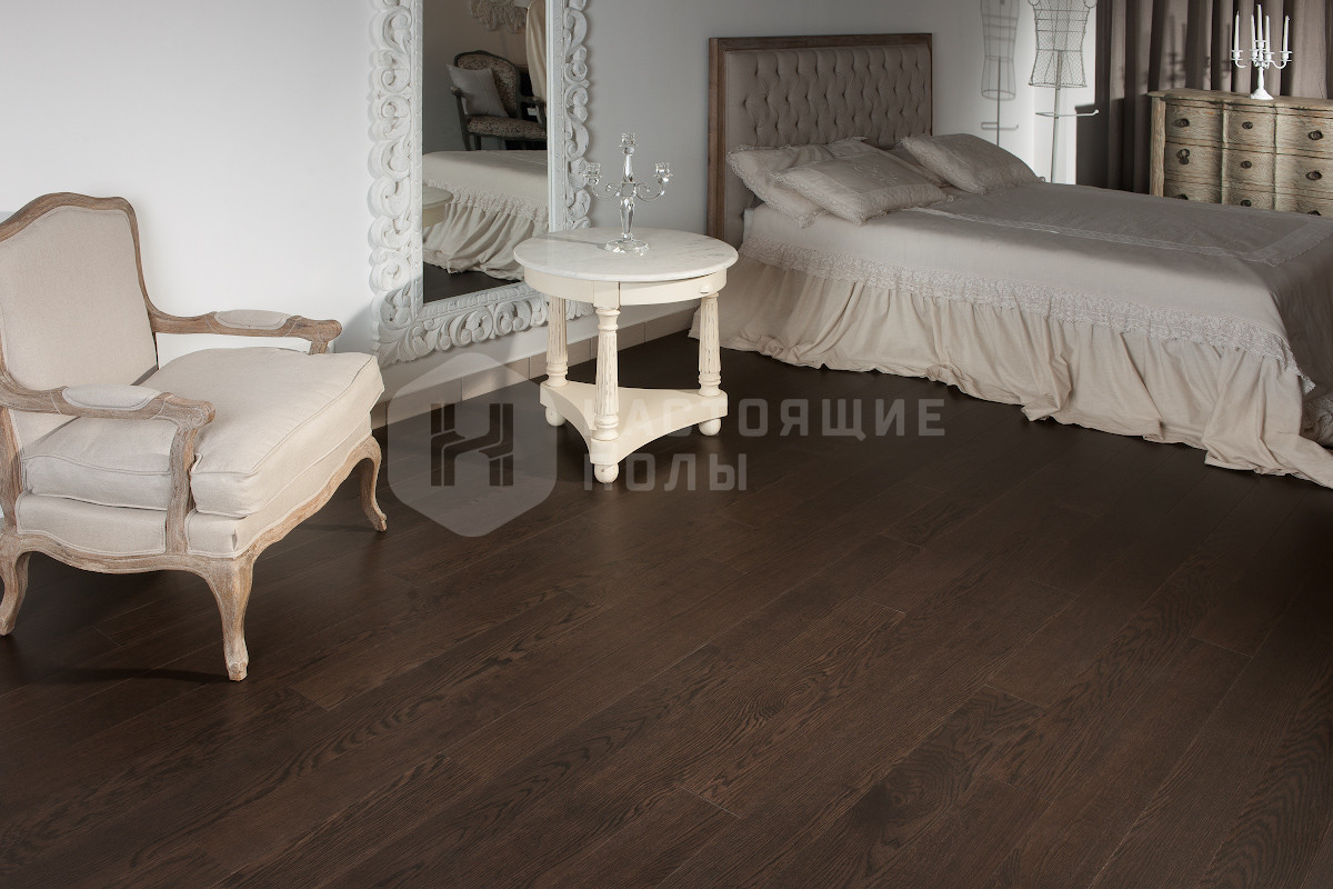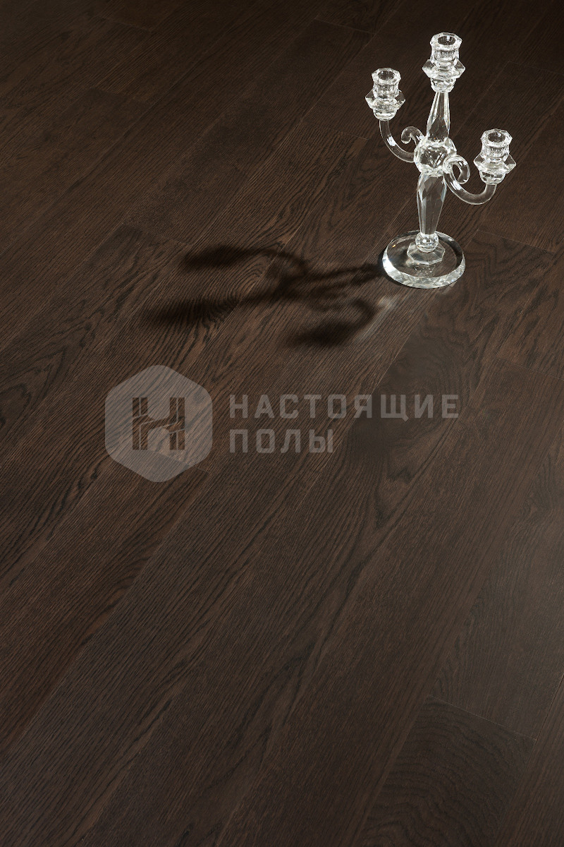 Формат паркета, когда верхний слой доски - это единый пласт благородной древесины, как здесь, например. Вне зависимости от ширины, именно такие декоры считаются самыми интересными. Здесь есть где показать всю красоту дерева, переходы цвета, селекцию, сучки и другие особенности древесины. Все новые цвета сначала выпускаются в однополосном формате, а уже потом, если дизайн пользуется популярностью, его повторяют в менее дорогих вариантах.