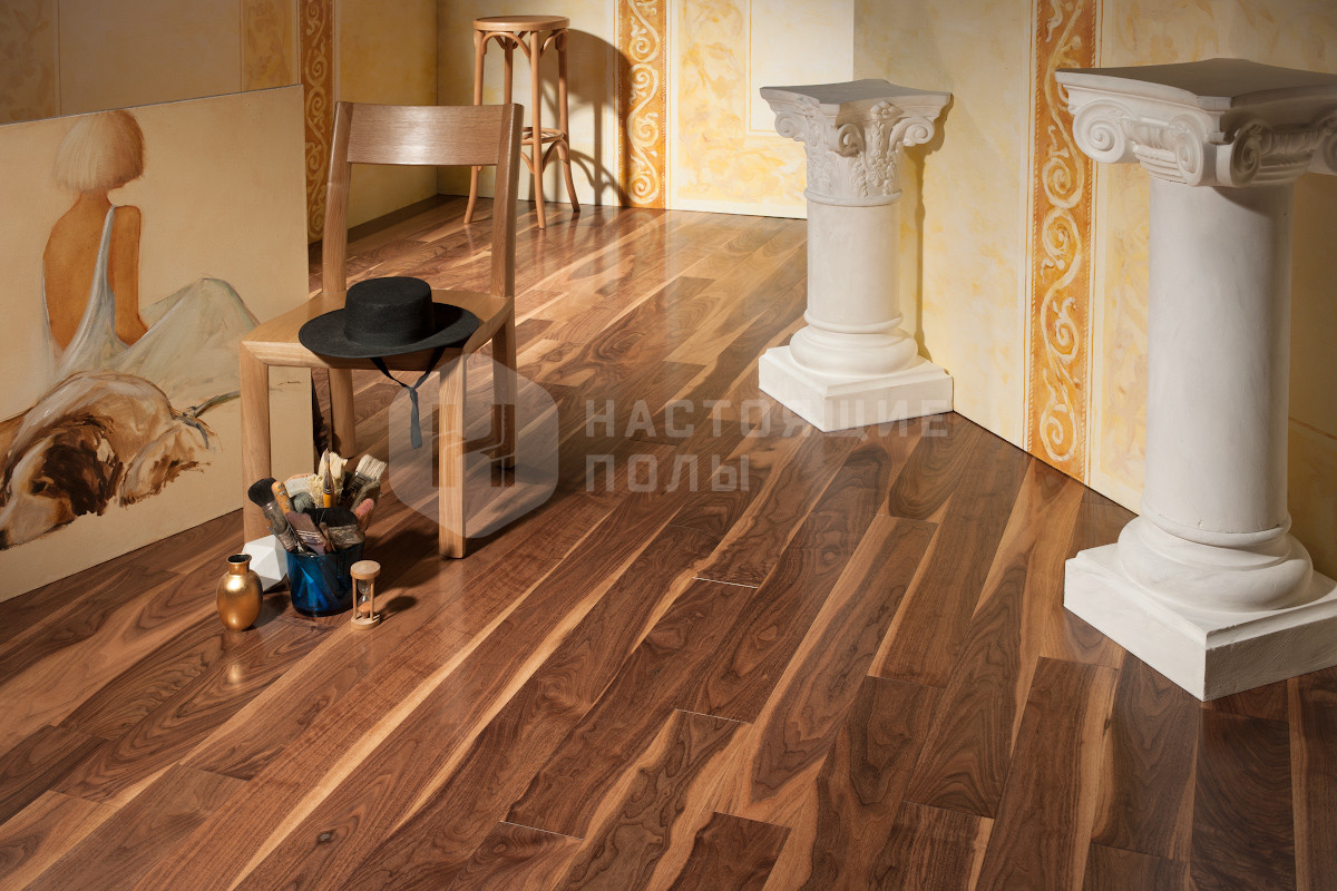 Формат паркета, когда верхний слой доски - это единый пласт благородной древесины, как здесь, например. Вне зависимости от ширины, именно такие декоры считаются самыми интересными. Здесь есть где показать всю красоту дерева, переходы цвета, селекцию, сучки и другие особенности древесины. Все новые цвета сначала выпускаются в однополосном формате, а уже потом, если дизайн пользуется популярностью, его повторяют в менее дорогих вариантах.