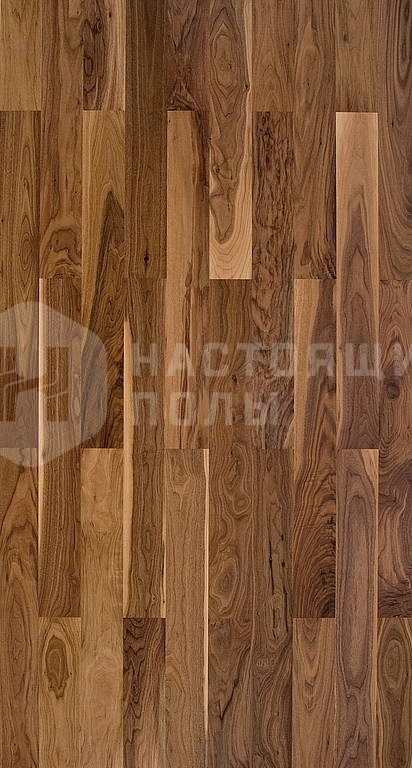 Формат паркета, когда верхний слой доски - это единый пласт благородной древесины, как здесь, например. Вне зависимости от ширины, именно такие декоры считаются самыми интересными. Здесь есть где показать всю красоту дерева, переходы цвета, селекцию, сучки и другие особенности древесины. Все новые цвета сначала выпускаются в однополосном формате, а уже потом, если дизайн пользуется популярностью, его повторяют в менее дорогих вариантах.