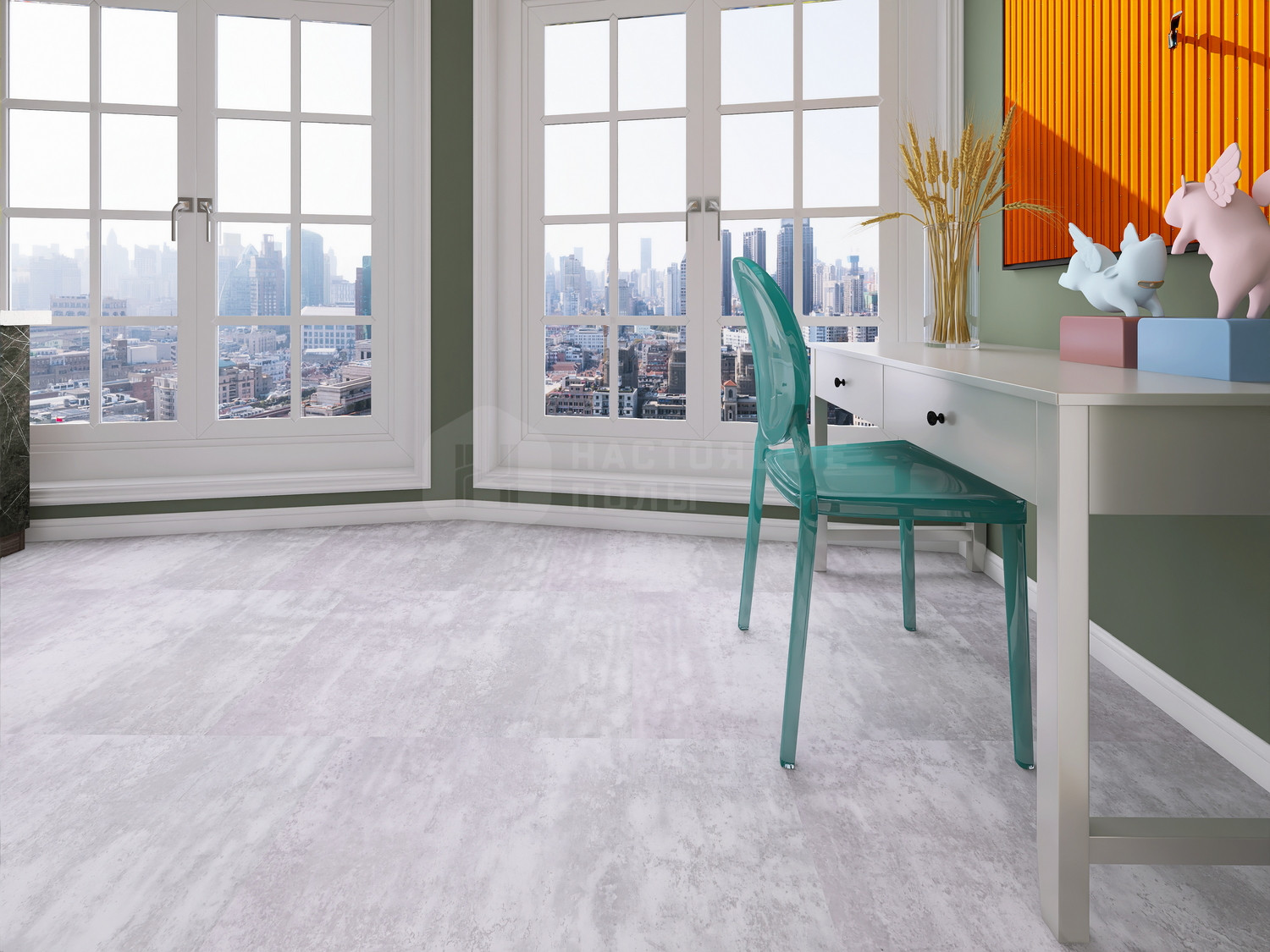 SPC (каменно-полимерный композит) — материал, который прочнее ПВХ и стабильнее дерева, не боится воды и не деформируется со временем. Размеры плитки — 900 х 600 мм, толщина — 4 мм, что обеспечивает удобство укладки и достаточную жесткость. Класс износостойкости 43 позволяет использовать покрытие в офисах, коридорах и других местах с большой нагрузкой. Замковый тип укладки упрощает монтаж, а динамичный рисунок «серый камень» придаст интерьеру стильный вид. Фаска 4V создает эффект объемности и маскирует мелкие неровности пола.