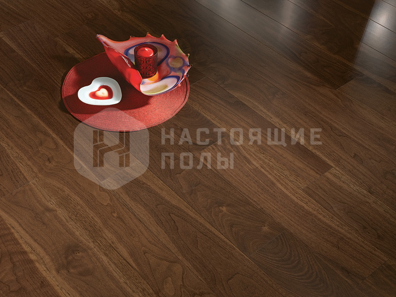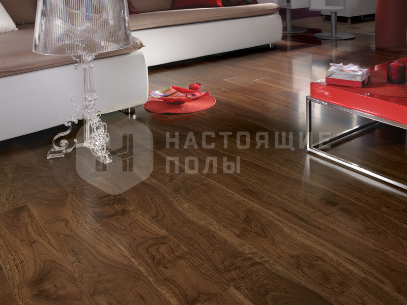 Формат паркета, когда верхний слой доски - это единый пласт благородной древесины, как здесь, например. Вне зависимости от ширины, именно такие декоры считаются самыми интересными. Здесь есть где показать всю красоту дерева, переходы цвета, селекцию, сучки и другие особенности древесины. Все новые цвета сначала выпускаются в однополосном формате, а уже потом, если дизайн пользуется популярностью, его повторяют в менее дорогих вариантах.