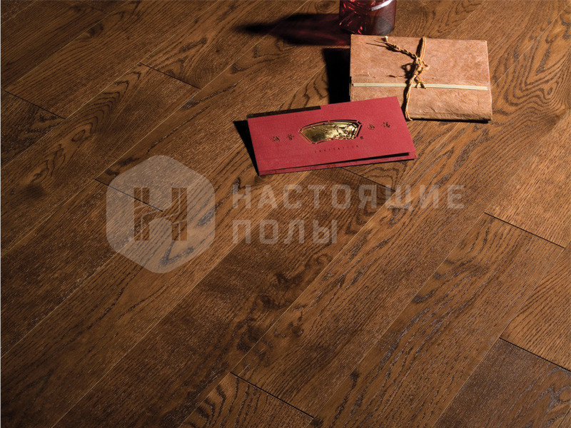 Формат паркета, когда верхний слой доски - это единый пласт благородной древесины, как здесь, например. Вне зависимости от ширины, именно такие декоры считаются самыми интересными. Здесь есть где показать всю красоту дерева, переходы цвета, селекцию, сучки и другие особенности древесины. Все новые цвета сначала выпускаются в однополосном формате, а уже потом, если дизайн пользуется популярностью, его повторяют в менее дорогих вариантах.