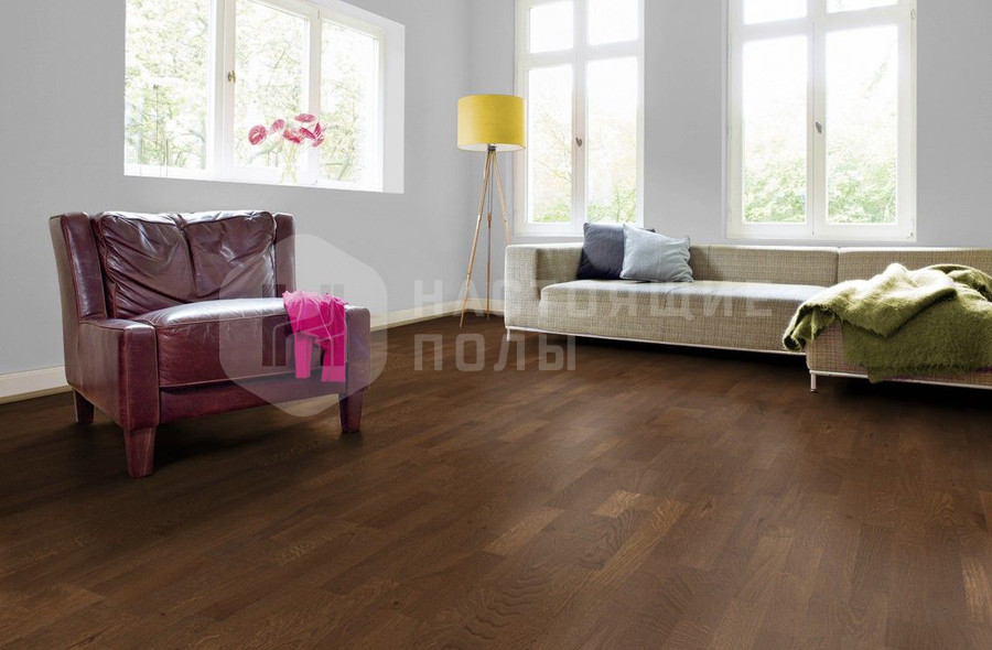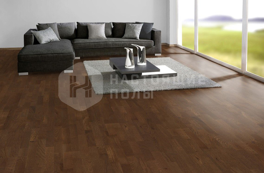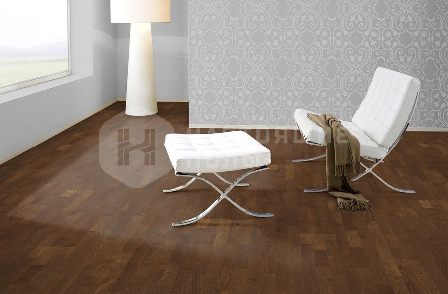 это когда на одной доске паркета три параллельных ряда ламелей. Чтобы уложенный пол смотрелся более живо, ламели делаются разной длины и перемешиваются между собой, когда идет сборка верхнего слоя доски. В трехполосном паркете ламели, как правило, довольно узкие (не шире 7 см), это позволяет регулировать селекцию всего пола. Маленькие досочки проще сортировать, чтобы получить либо ровную, спокойную селекцию, либо живой декор в стиле рустик.