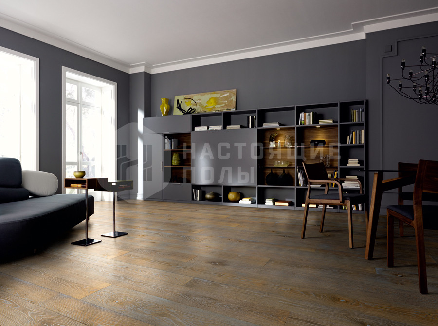 Формат паркета, когда верхний слой доски - это единый пласт благородной древесины, как здесь, например. Вне зависимости от ширины, именно такие декоры считаются самыми интересными. Здесь есть где показать всю красоту дерева, переходы цвета, селекцию, сучки и другие особенности древесины. Все новые цвета сначала выпускаются в однополосном формате, а уже потом, если дизайн пользуется популярностью, его повторяют в менее дорогих вариантах.