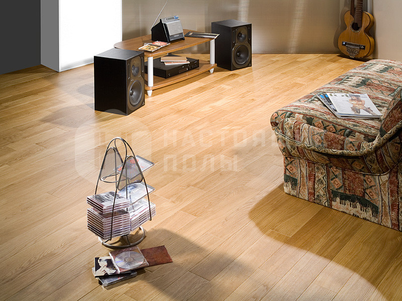 Конструкция, которую еще называют паркетной доской. Состоит она из 3 слоев: верхнего слоя благородной древесины толщиной 3.2 мм, среднего слоя из березы и нижнего, стабилизирующего слоя из березы. Толщина верхнего слоя позволяет циклевать паркет до 4 раз.