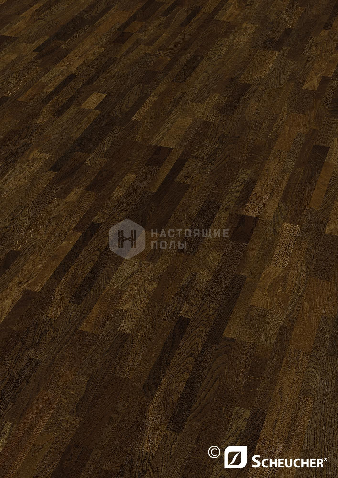 Трехслойная паркетная доска Scheucher Parkett Impression Дуб Копченый Натур трехполосный под маслом: массив благородной древесины, приклеенный на доску из хвои, а в основе всей конструкции - сосна. Стабильность конструкции придает поперечное приклеивание слоев.