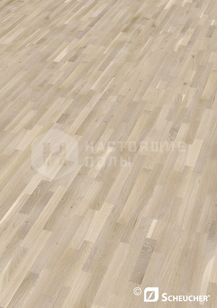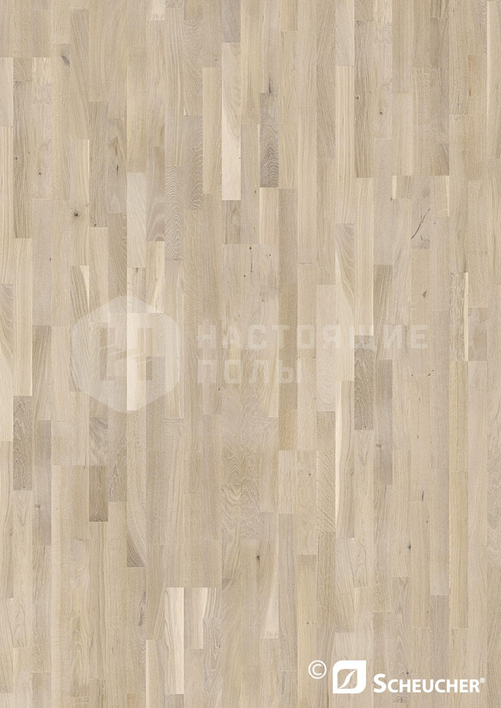 Трехслойная паркетная доска Scheucher Parkett Elevation Дуб Зюльт трехполосный: массив благородной древесины, приклеенный на доску из хвои, а в основе всей конструкции - сосна. Стабильность конструкции придает поперечное приклеивание слоев.